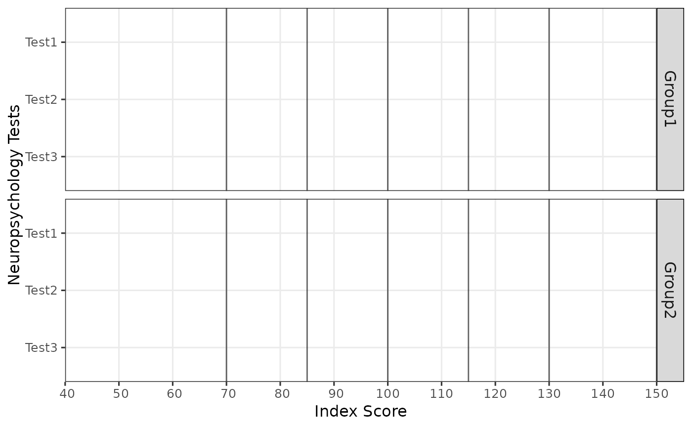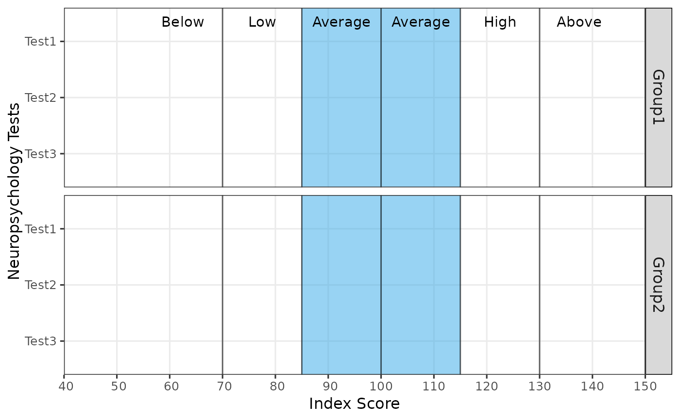Creates a Bar plot visualizing scores and their confidence intervals across different tests and groups. The plot includes optional shading and descriptors to provide additional context.